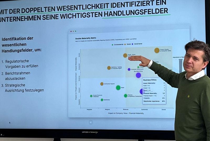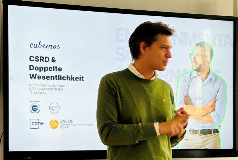 Nach einer kleinen Pause, die zum Networking genutzt wurde, ging es mit einem sehr interessanten Bericht zur CSRD weiter. Dr. Christopher Scheubel, Co-Founder und CEO der cubemos GmbH führte die Teilnehmer in die Weiten der Doppelten Wesentlichkeitsprüfung ein. Teilnehmer, die dem Thema nicht so zugewandt waren, holte Dr. Scheubel von Anfang an ab und erklärte sowohl die Entstehung der CSRD als auch deren Ziele. Für die bereits „CSRD-involvierten“ Zuhörer gab es dazu noch die Einweisung in die Doppelte Wesentlichkeit.