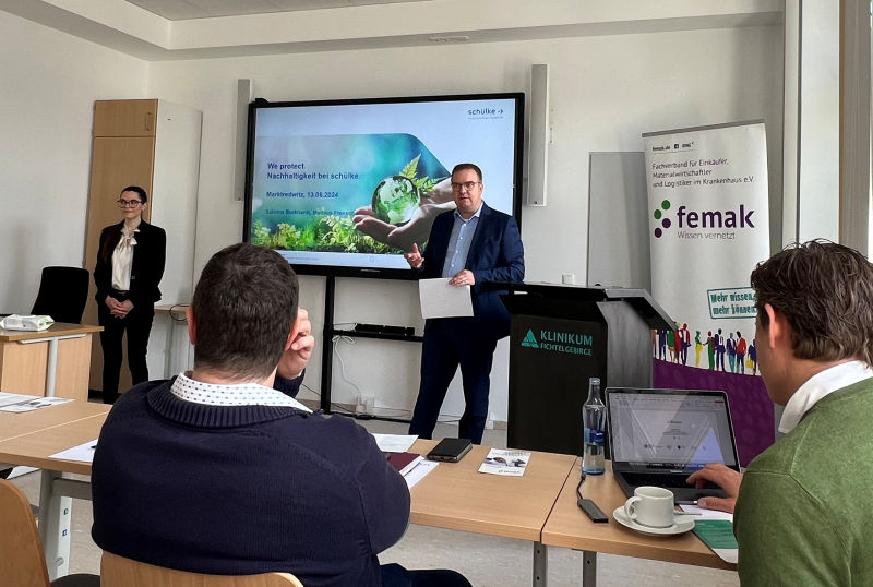 Nach der Begrüßung durch den stellvertretenden Wirtschaftsleiter, Jörg Wesemann, berichteten Mathias Frensch, regionaler Verkaufsleiter und Sabrina Burkhardt, Vertrieb Hygiene International, Gebietsverkaufsleiterin Healthcare, beider von der Firma Schülke, welche Bestrebungen die Firma Schülke in Bezug auf Nachhaltigkeit unternimmt.